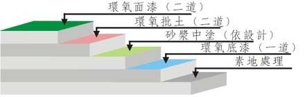 2.環(huán)氧底漆:采用滲透性及附著力特強(qiáng)環(huán)氧底漆滾涂一道,增強(qiáng)表面附著力;